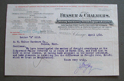 #208 - old 1893 FRASER & CHALMERS MINE MACHINERY letterhead to HELENA MONTANA