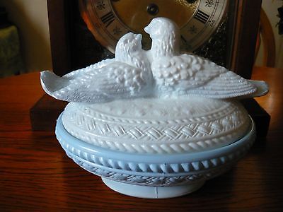 Vintage Westmoreland Blue Milk Glass Love Birds On Nest Covered Candy Dish