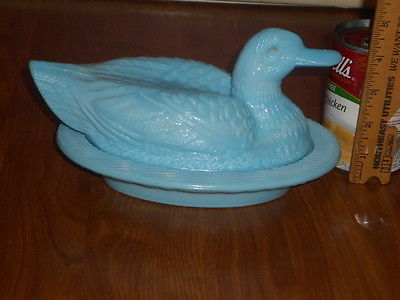 Westmoreland Covered Duck on Nest Blue Milk Glass
