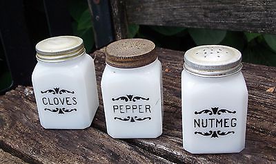 Title (ebay affiliate link): 3 Vintage Milk Glass Spice Shakers Jars w Brand Labels Hazel Atlas? McKee?