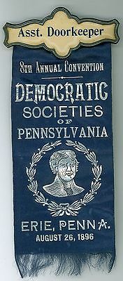 Vintage 1896 Democratic Societies Pennsylvania Campaign Pinback Ribbon Erie PA