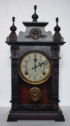 ANTIQUE 3 FINIAL CREST HIGHLY DECORATED MANTLE CLOCK