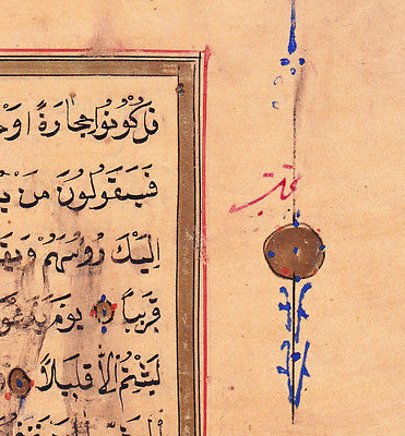 Title (ebay affiliate link): 1 Leaf Beautiful BLUE Ink Arabic Manuscript with Large Gold Ayat Circles