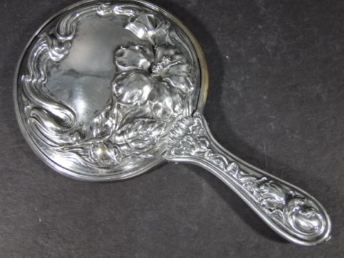 Title (ebay affiliate link): Antique Art Nouveau Silver Plate Hand Vanity MIRROR Highly Raised Flowers