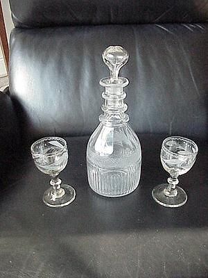 EARLY GLASS DECANTER WITH 2 EARLY ETCHED GOBLETS