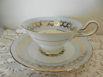 Grosvenor English Tea Cup & Saucer, Pale Blue with Gold Gilt, Floral Center