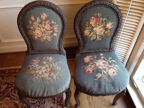 Title (ebay affiliate link): Pair Of 1930'S Mahogany Tulip Inlay & Petit Point Parlor Chairs