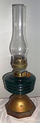 Title (ebay affiliate link): vintage brass bluey green glass OIL LAMP lantern and chimney glass british made