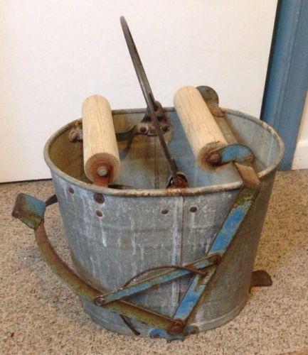 Vintage Galvanized Metal Mop Bucket Wood Wringer Primitive Farm Decor Foot Lever