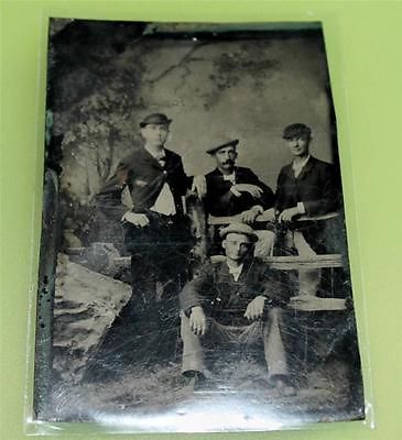 Antique Tintype 4 Men Wearing Hats Group Friends Split Rail Fence FREE SHIPPING