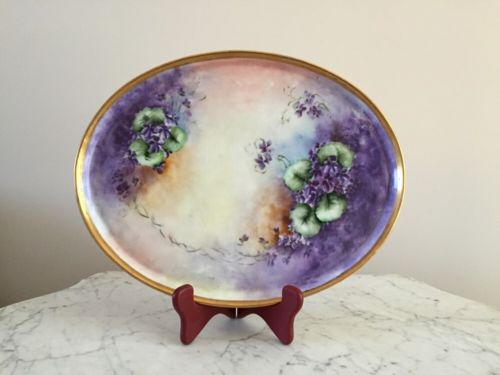 Antique Signed T V Limoges Violet Vanity Dresser Oval Tray