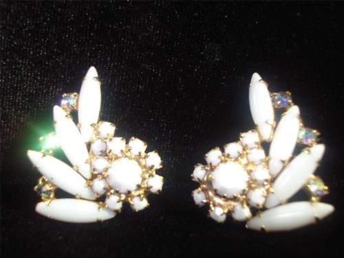 GORGEOUS,Vintage,MILK GLASS EARRINGS, AURORA BOREALIS RHINESTONES,GOLD TONE,CLIP