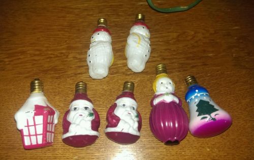 Title (ebay affiliate link): 7 Vintage Milk? Glass Christmas Light Strand Bulbs Lot Santa, Tree, Snowmen Age?