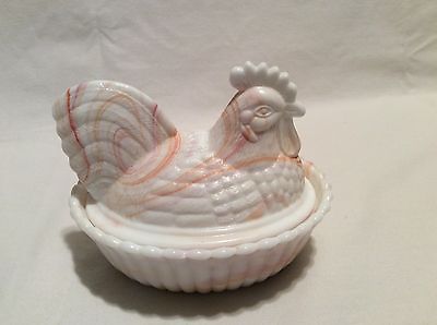 Title (ebay affiliate link): Vintage Westmoreland Hen on Nest Swirl milk glass 5.5" long orange yellow white