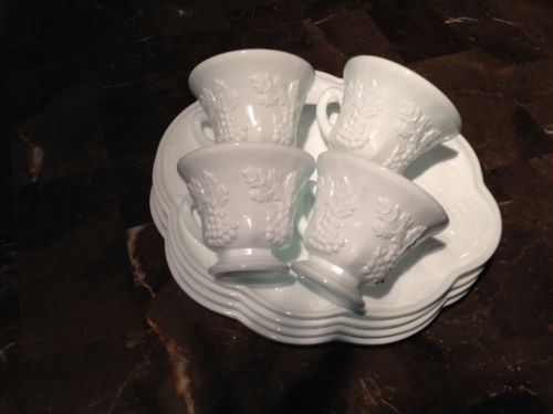 Title (ebay affiliate link): 8pc Indiana Colony Milk Glass White Harvest Grape Snack Luncheon Cup/Plate Set
