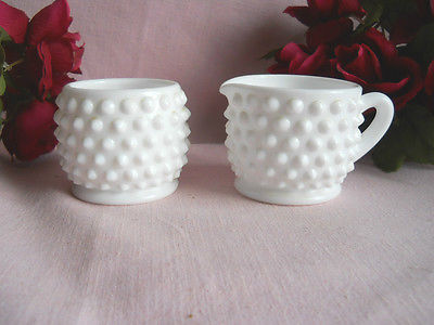 Title (ebay affiliate link): VINTAGE WHITE FENTON MILK GLASS HOBNAIL SMALL SUGAR BOWL AND CREAMER SET