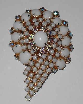 Title (ebay affiliate link): Vintage Juliana Style White Milkglass AB Rhinestone Brooch ~ Stunning!