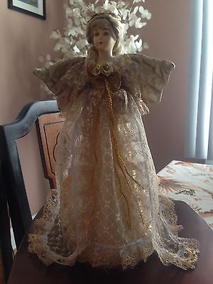 VINTAGE CHRISTMAS TREE TOPPER ANGEL W/GOLDEN WINGS AND LACE METALIC DRESS