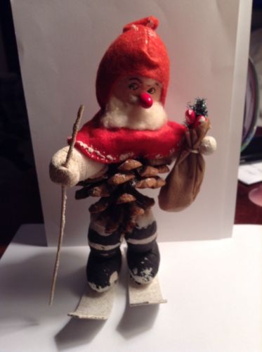 Title (ebay affiliate link): VINTAGE COMPOSITION WIRE SPUN COTTON PINE CONE ELF SANTA HOLDING A BAG 7" TALL