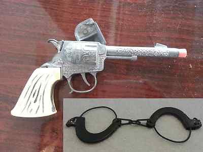 VINTAGE 1960s COWPOKE TOY CAP GUN WESTERN PISTOL & TOY TIN HANDCUFFS