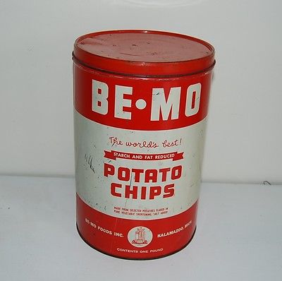 Title (ebay affiliate link): Be-Mo Potato Chips Tin, Be-Mo Foods Inc. Kalamazoo, Mich. 1950's