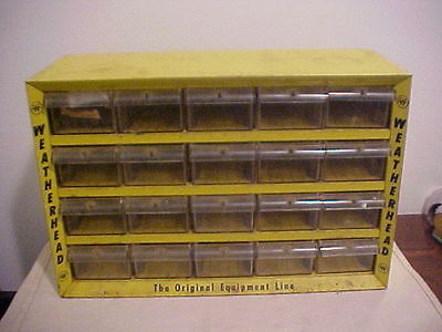 Title (ebay affiliate link): VINTAGE WEATHERHEAD METAL PARTS CABINET, 20 CLEAR PLASTIC TRAYS.
