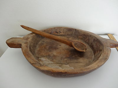 Title (ebay affiliate link): Vintage carved flat round wooden bowl with handles and spoon