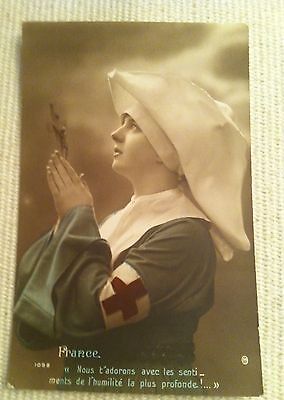 Antique WWI France French Postcard RED CROSS NURSE NUN holding Crucifix PRAYING