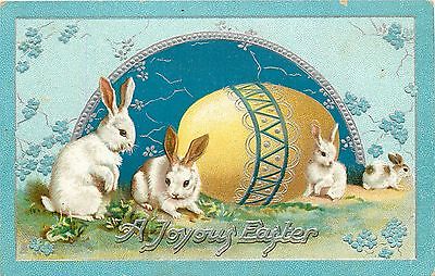 Easter~Cuddly Soft White Bunnies~Yellow Decorated Egg~Silver Blue Emboss~TUCK