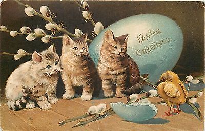 Easter~Striped Kitty Cats Watch Lil Chick Hatch From Blue Egg~Pussy Willows~EMB