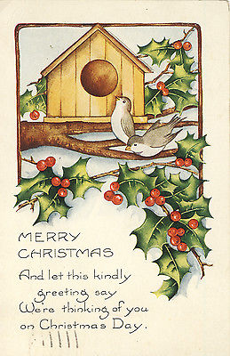 VINTAGE POSTCARD CHRISTMAS HOLLY LEAVES BERRIES BIRDS 1923