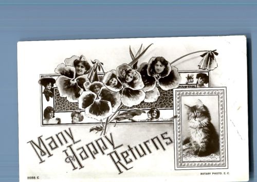 Title (ebay affiliate link): Many happy returns cat Pansy fantasy antique rotary photo postcard