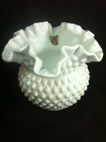 Title (ebay affiliate link): Vintage Fenton White Milk Glass Hobnail Ruffled Basket Bowl Vase Compote Marked