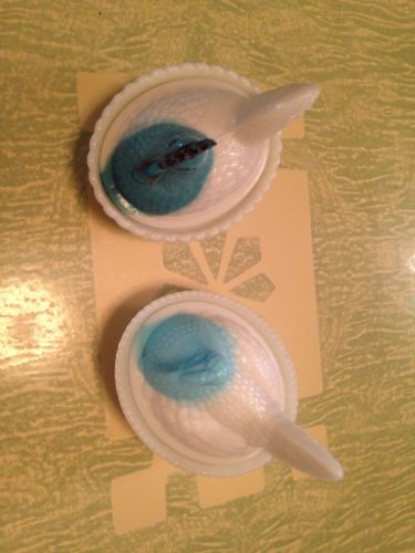 Title (ebay affiliate link): 2 Covered Chicken Dishes. Milk Glass With Blue Heads. Painted Comb on one.