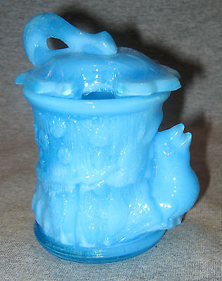 MUSTARD OR HORSERADISH CONDIMENT COVERED JAR BLUE MILK GLASS BIRD IN TREE STUMP