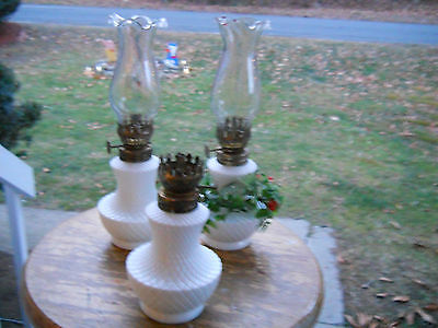 vintage milkglass mini oil lamps 3 base, 2 chimneys. diamond shape design