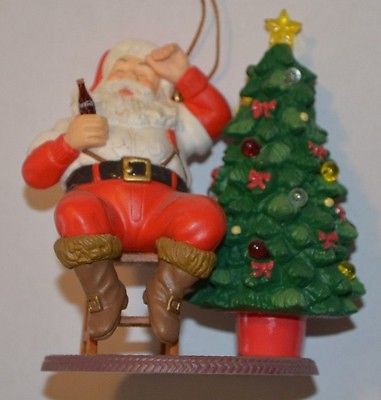 Title (ebay affiliate link): Coca-Cola Christmas Ornament Santa Claus with Christmas Tree Sitting on a Stool