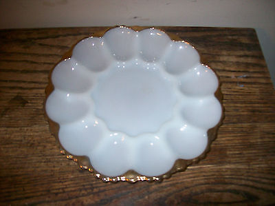 10" Round White Milk Glass Egg Plate with Gold Trim