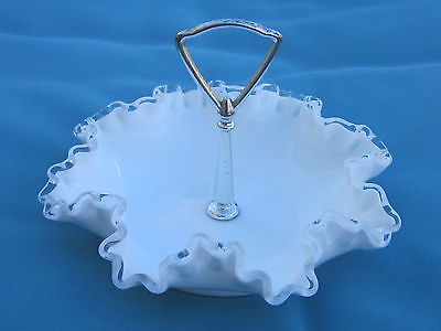 Vintage Fenton Milk Glass Ruffle Silver Crest Bowl Handle