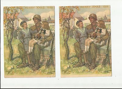 2-1944 Merry Christmas Holiday Cards Military Soldier w/Children Artist Signed