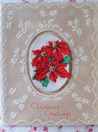 Title (ebay affiliate link): ~ Vtg 1940s UNUSED Elegant Christmas Card w/ Lace, Poinsettias & Mini Card ~