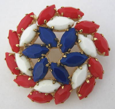 Vintage Red/White/Blue Milk Glass Rhinestone Brooch