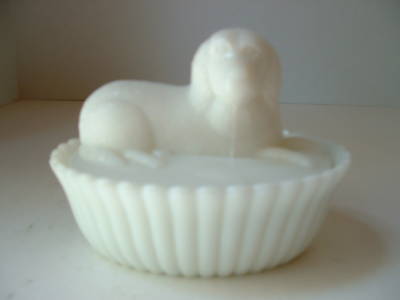 VINTAGE OPALESCENT MILK GLASS DOG CANDY / POWDER DISH