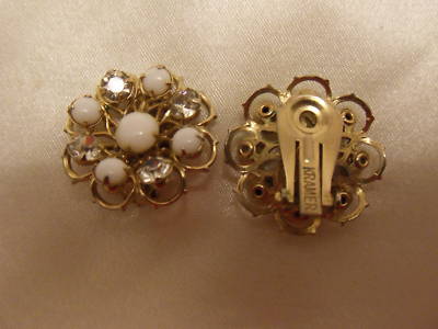 VINTAGE KRAMER MILK GLASS & RHINESTONE FLOWER EARRINGS