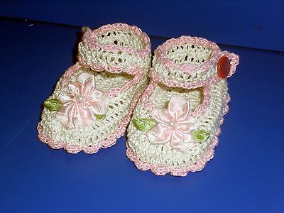 CROCHET HANDMADE BABY GIRL DOLL BOOTIES SHOES ANTIQUE WHITE & PINK MJ