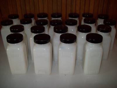 23-VINTAGE WHITE MILK GLASS SPICE JARS-DECO-BLACK CAPS