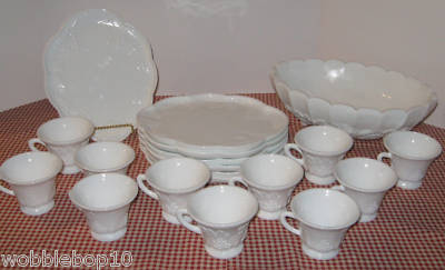 Lot of Milk Glass Plates, Cups, & Bowl Set 19 pieces!!