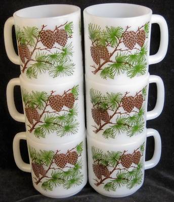 6 vtg GLASBAKE CHRISTMAS PINE tree cone milk glass mugs