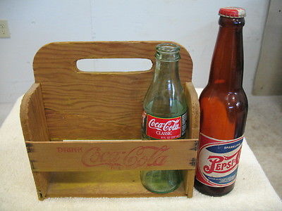 Title (ebay affiliate link): Vintage Coca-cola wooden carrier with bottle and vintage Pepsi bottle