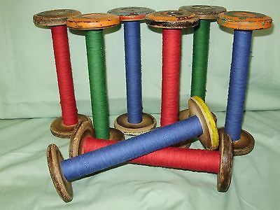 Title (ebay affiliate link): 8 VINTAGE TEXTILE WOODEN TEXTILE MILL SPOOLS, BOBBINS W/YARN